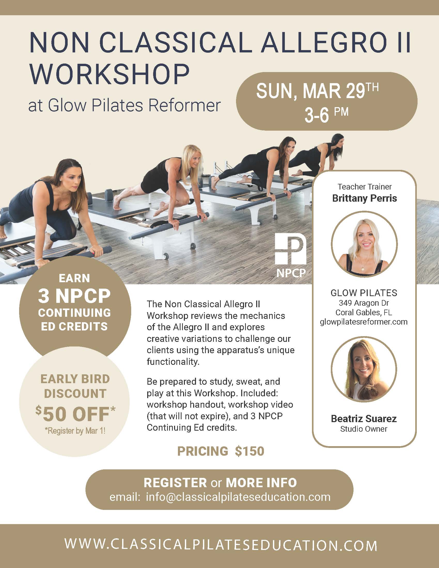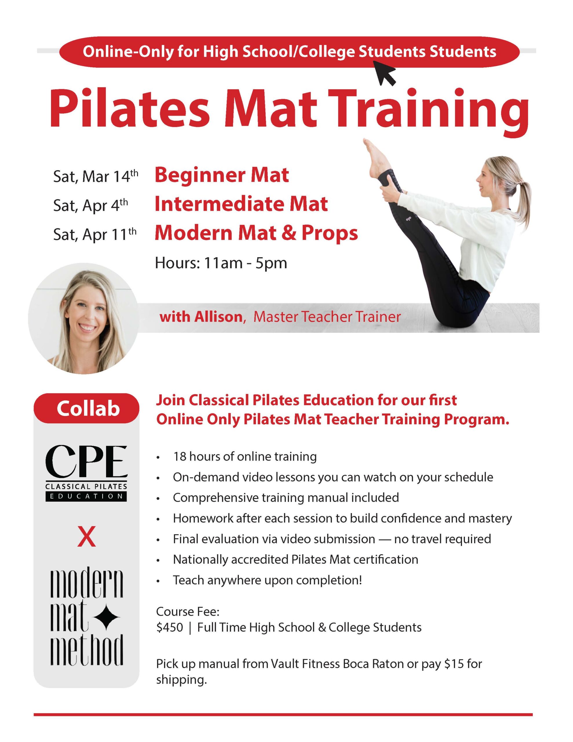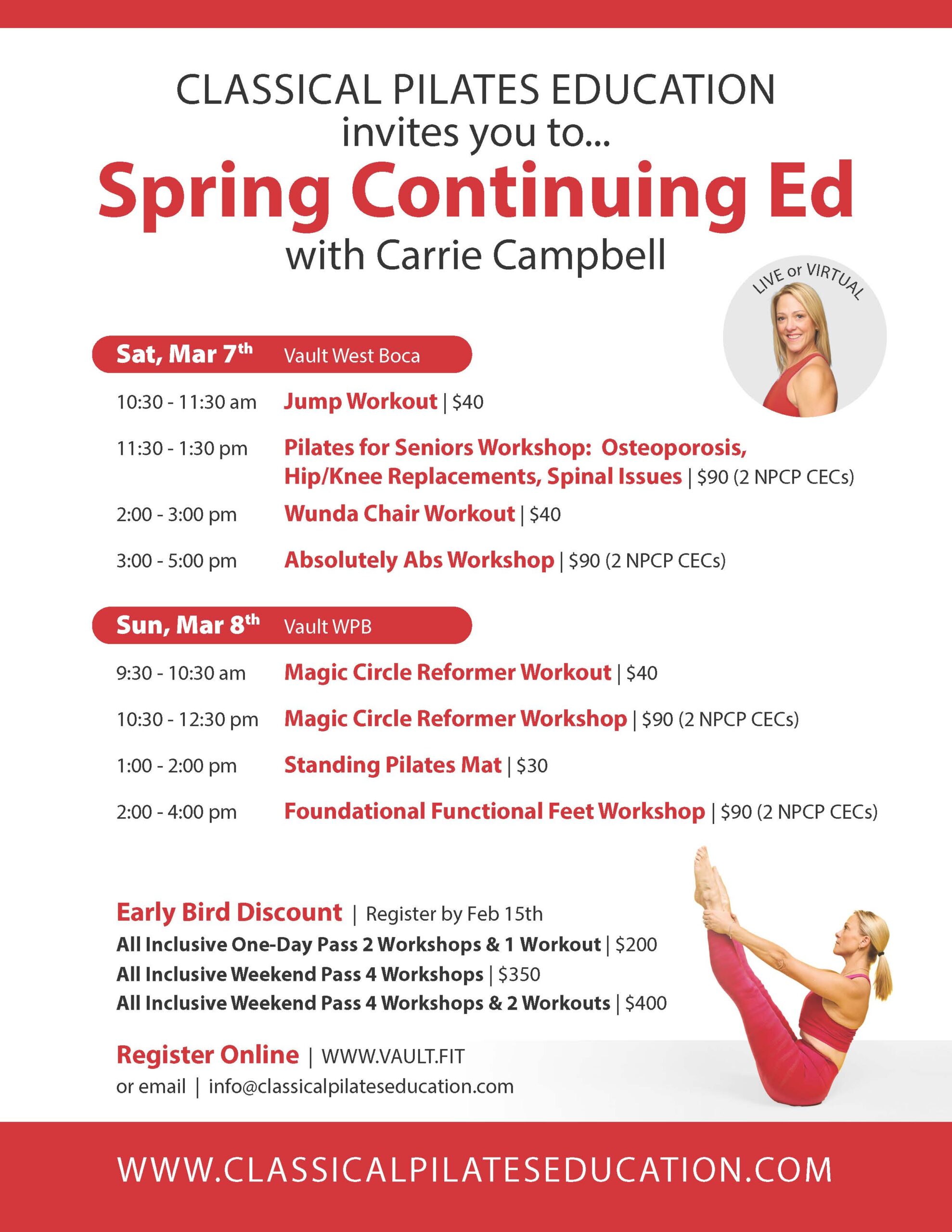 | Boca/WPB CPE | Pilates for Seniors Workshop $90, Absolutely Abs Workshop $90, Magic Circle Reformer Workshop $90, Foundational Functional Feet Workshop $90, All Inclusive Weekend Pass 4 Workshops $350 |